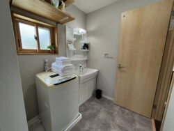 洗面スペースには洗濯機が備えられており、長期滞在にも対応。
