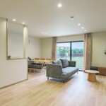 白やグレーを基調にしたナチュラルモダンなインテリアで、大きな窓からは暖かな日差しが降り注ぎ、ゆっくりくつろげる空間に。お天気のいい日は外のテラスで、朝食やコーヒータイムはいかがでしょう。