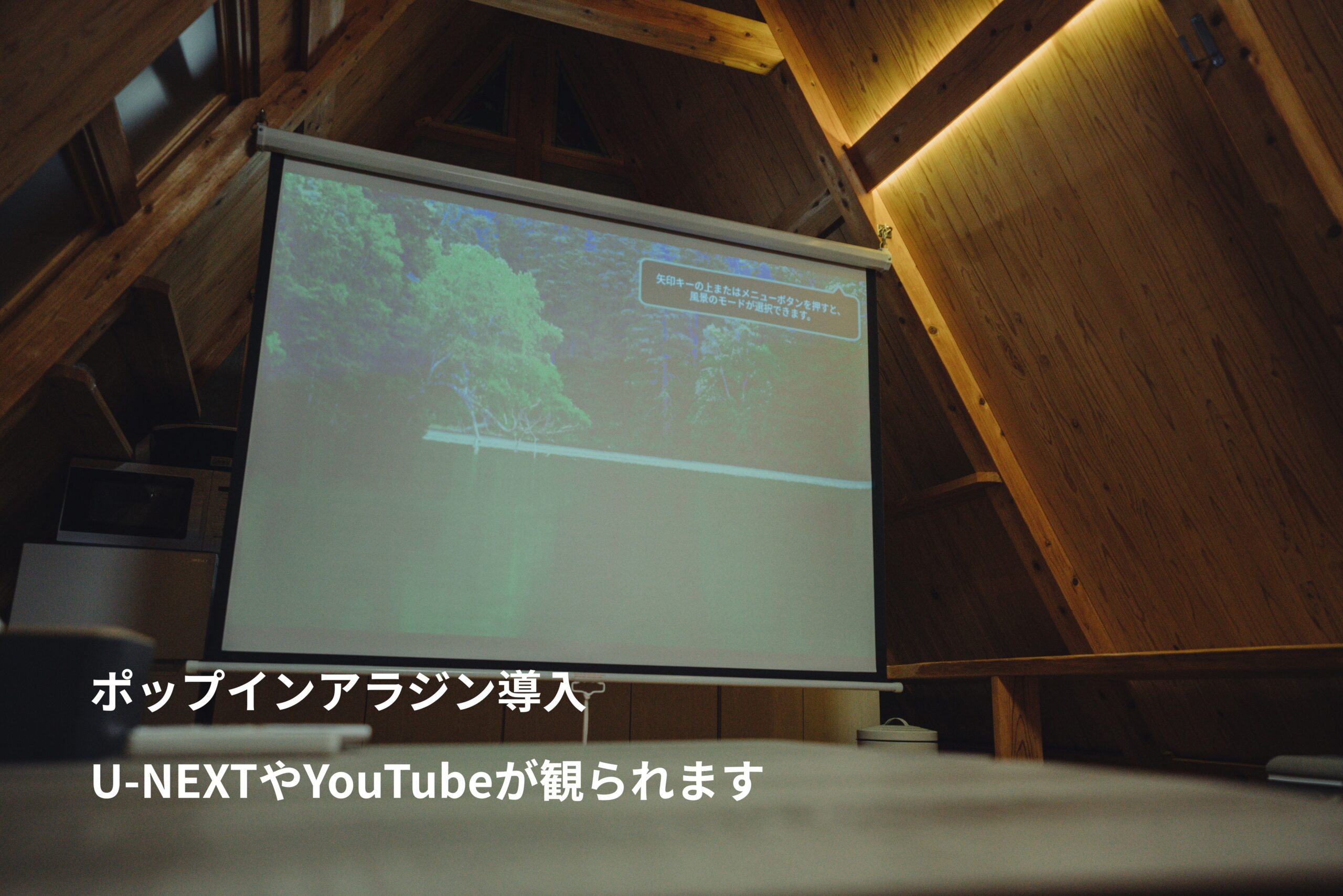 室内にはU-NEXTやYouTubeなどが見られる大型スクリーンがあり、極上の夜更かしタイムを。