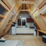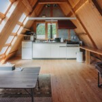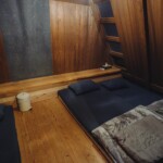 入って右手にキッチンとリビングスペースがあり、真ん中にトイレとバスルーム、左手が寝室があります。バスルームはサウナのあるデッキに通じています。