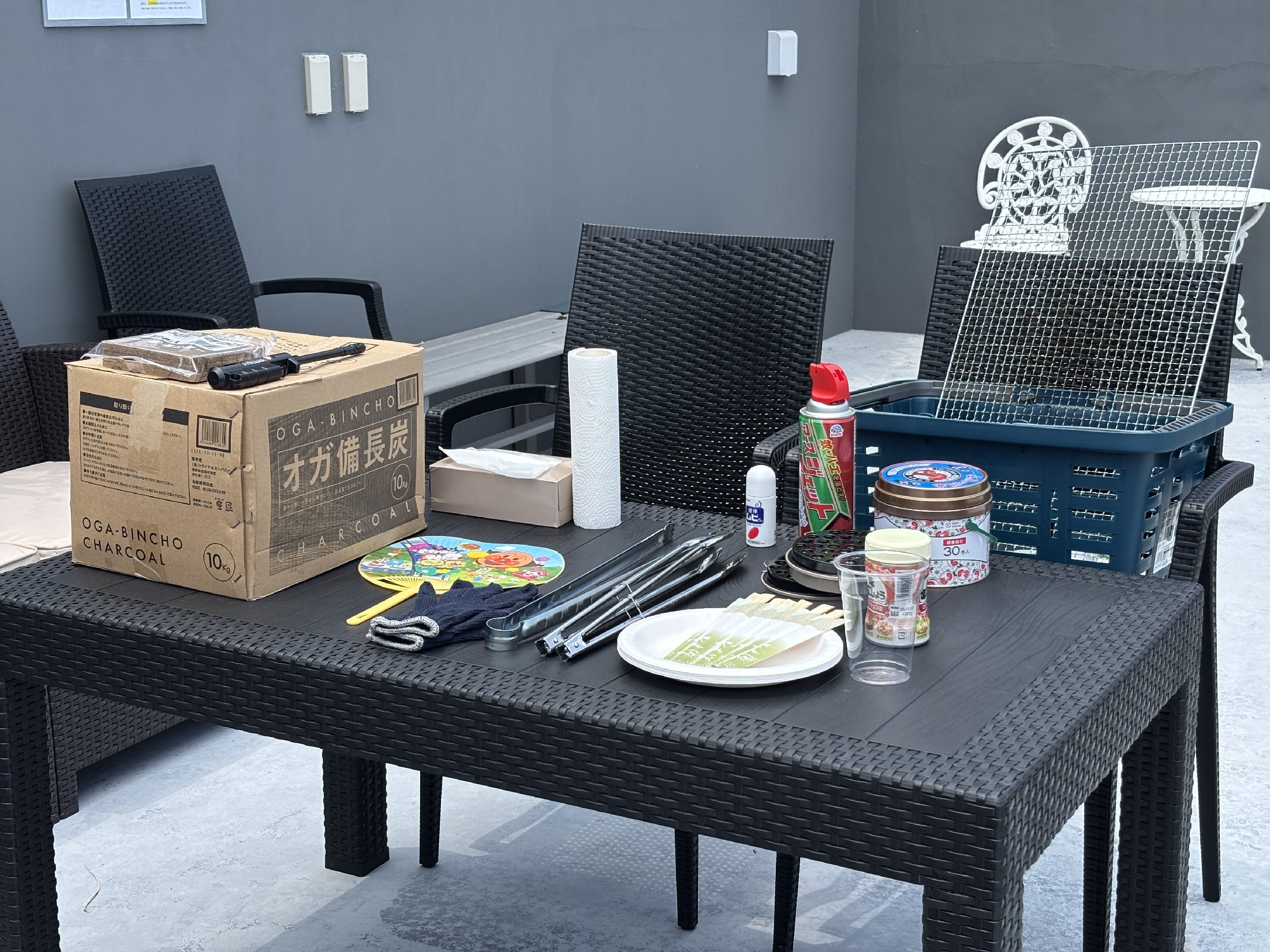 箸 ×16/紙皿 ×16/網/トング ×3/炭(1箱)/蚊取り線香/アースジェット(虫よけスプレー)/ムヒ(虫刺され薬)/塩コショウ/コップ/キッチンペーパー/ティッシュ/着火剤/ライター/うちわ/手袋