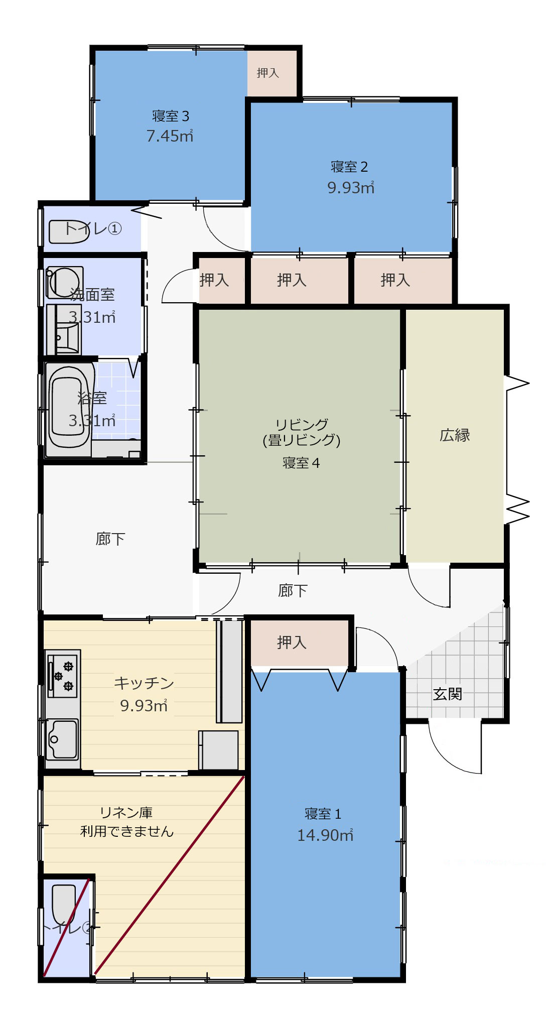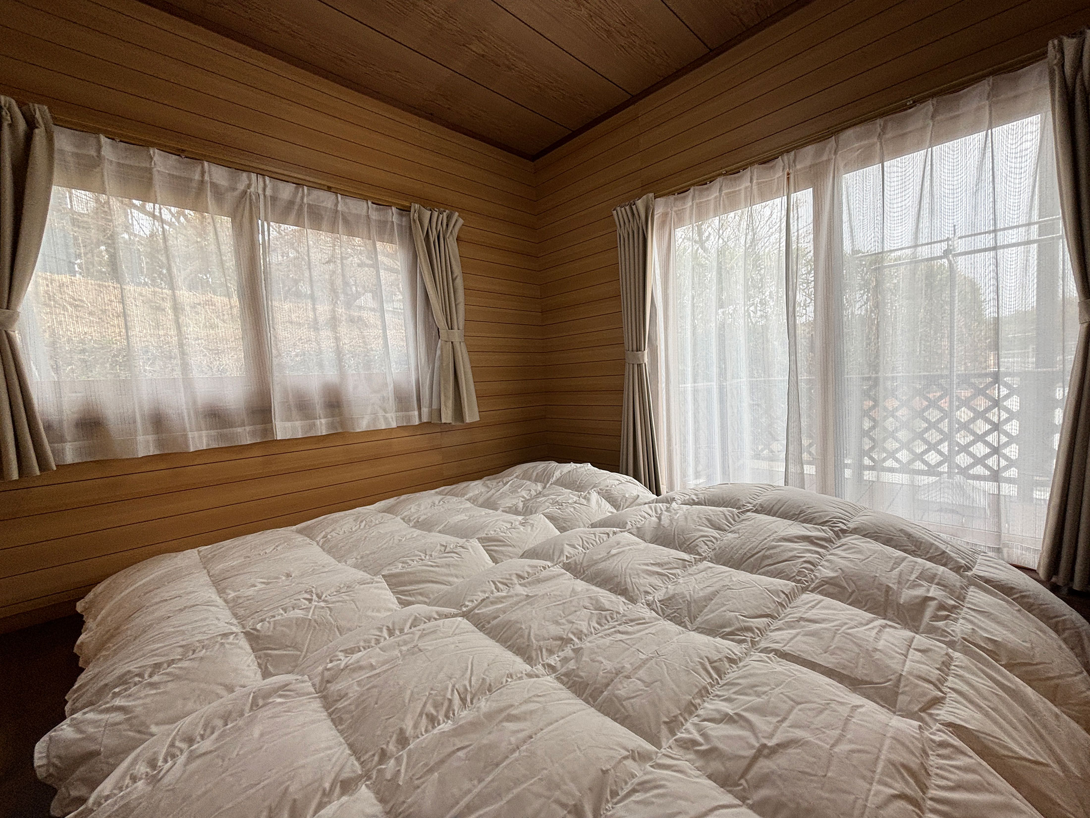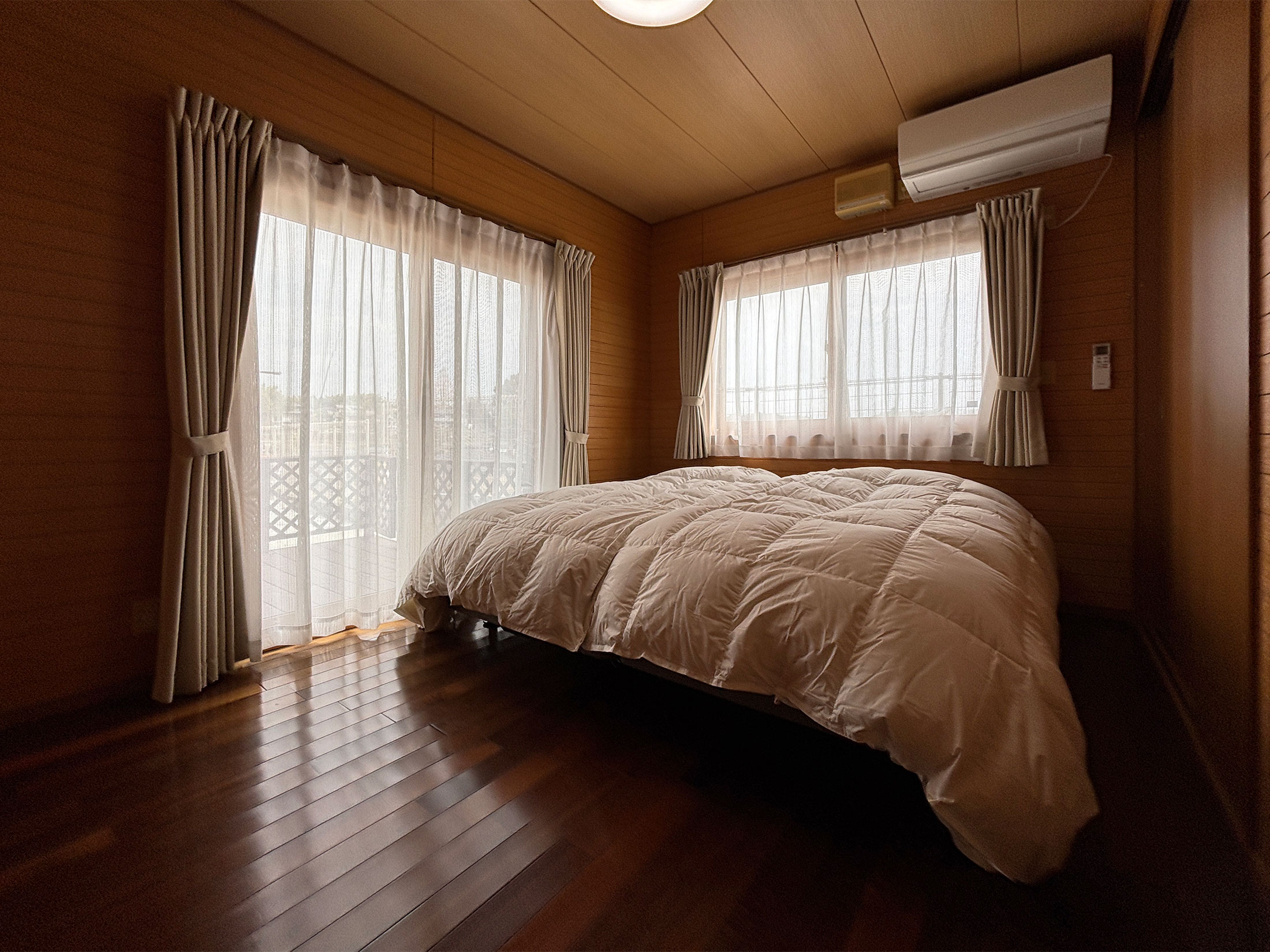 ⑦ご予約の人数が4名迄の場合は、寝室1にベッド×2セット、、寝室2にベッド×2セット、6名様以上では寝室3を開放し布団×2、7名様以上で寝室4(畳リビング)を開放し、お布団×2を追加させて頂きます。