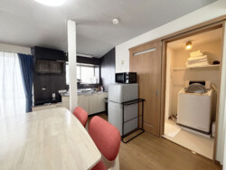 広々としたリビング&ダイニングスペースで、調理器具や電子レンジ、冷蔵庫を備えたキッチンルームが有りますので長期滞在もOK