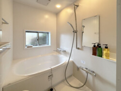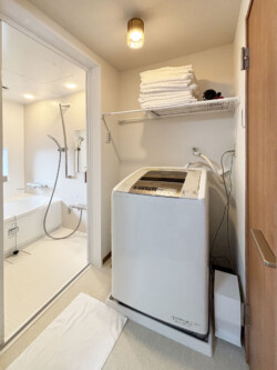 洗濯機、乾燥スペース、清潔なタオル類など、生活に必要な設備が整っています。モダンで清潔なバスルーム、使い心地の良いシャワーとバスタブ付きで快適です