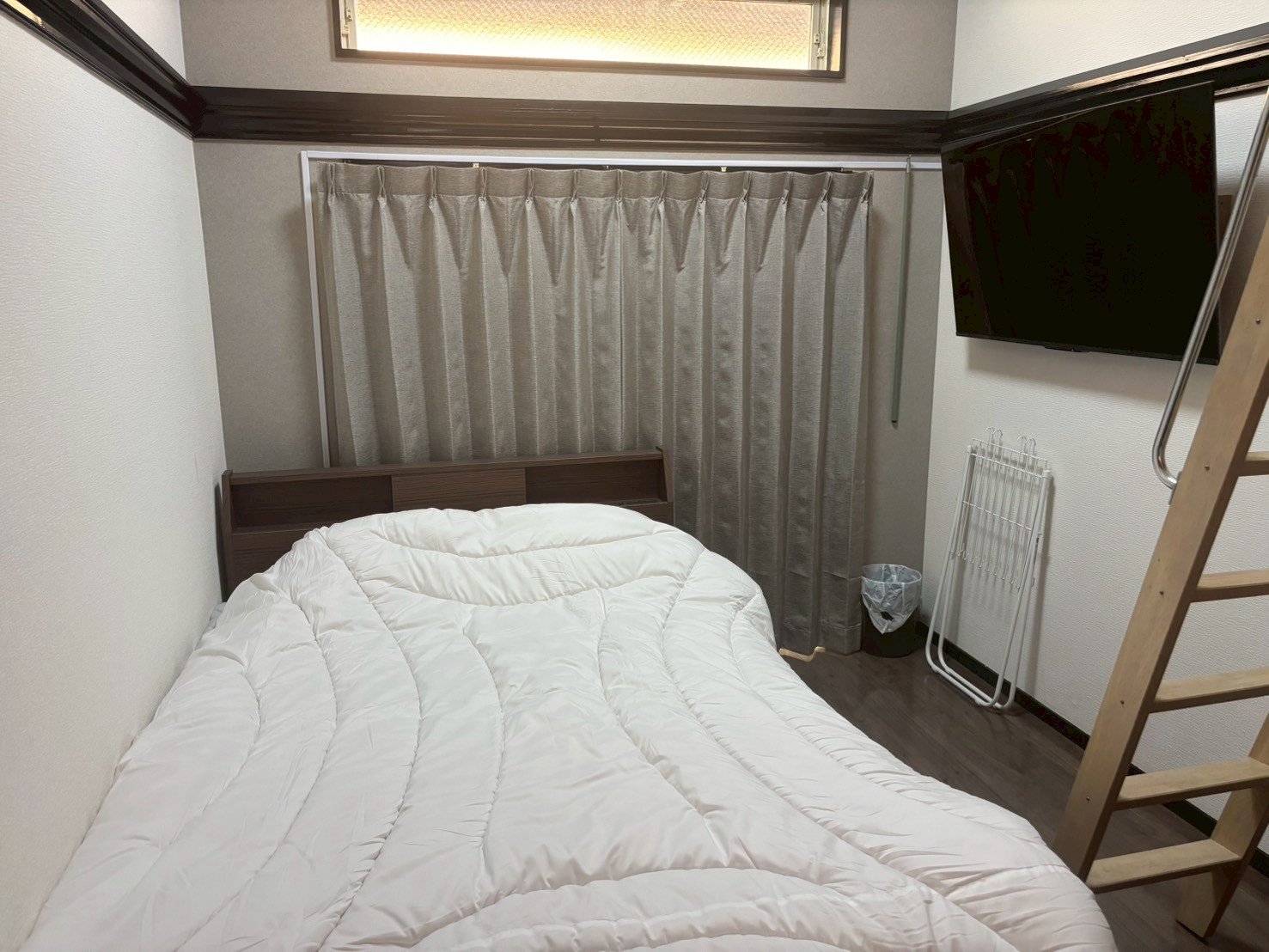 各室4名定員で、寝具はダブルベッド×1、シングル布団×2をご用意。壁掛けテレビ、エアコン、遮光カーテン、デスク&チェアも備え、ワーケーションや長めの滞在にもフィットします。