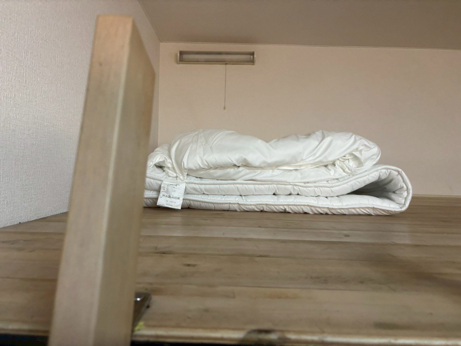 天井高を活かしたロフトは、まるで秘密基地。上段は布団を敷いてゴロゴロできるヌックのような空間で、子ども心がうずきます(就寝時は頭上クリアランスにご注意を)。下段にはダブルベッドを1台配置。