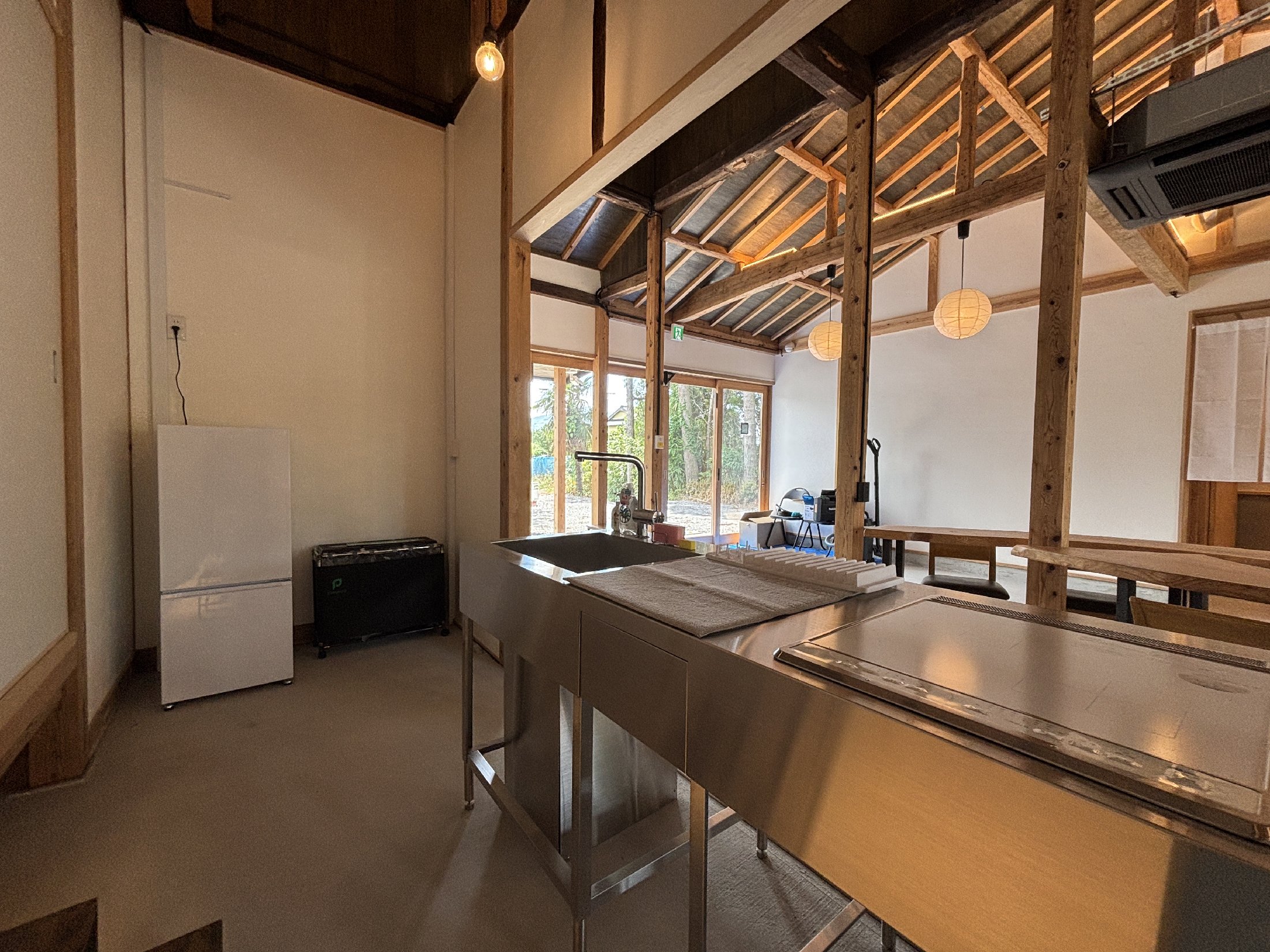 温泉施設のロビーのような広く開放的なスペースには、大きなテレビとキッチンが併設されており、皆さまでくつろぎながら過ごしたり、食事を楽しんだりできます。