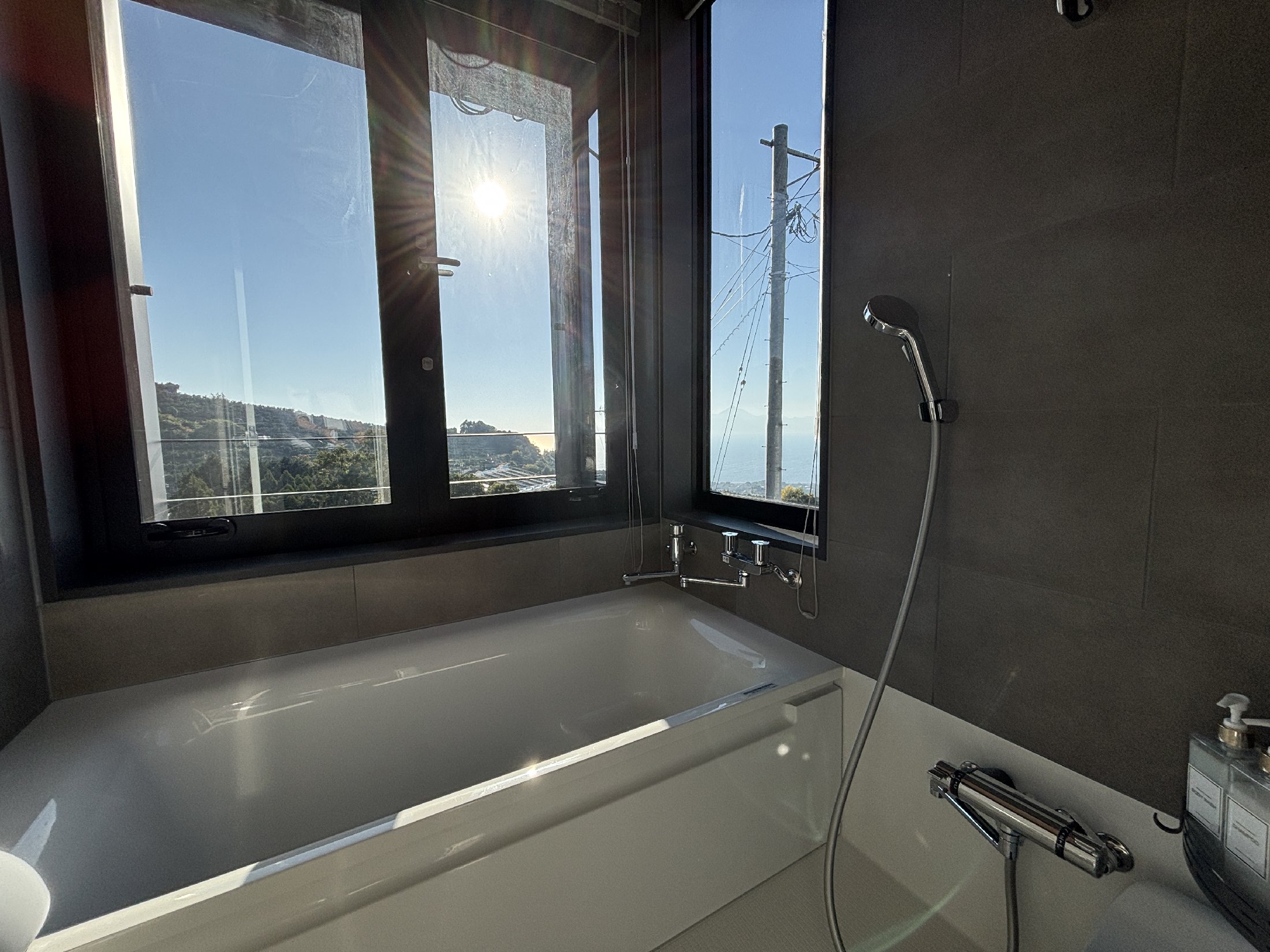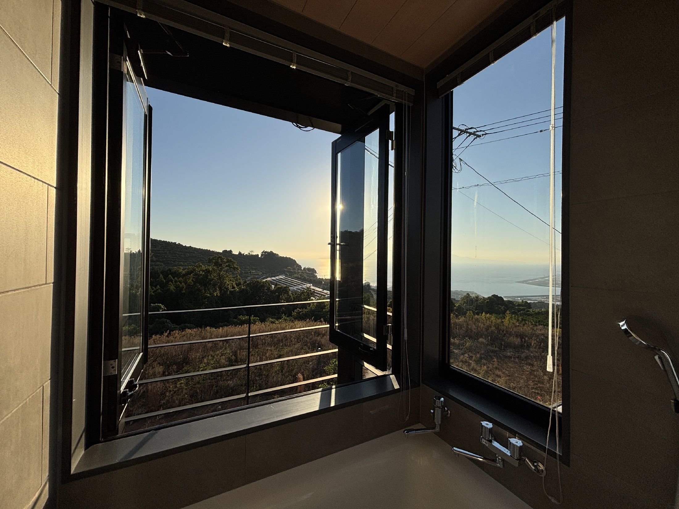 浴室の大きな窓は、この宿の象徴ともいえる存在です。湯船に浸かれば、切り取られた絵画のような海の景色が目の前に広がり、夕陽が沈む数十分間は、まさに独り占めの時間となります。