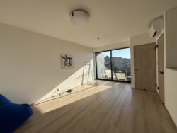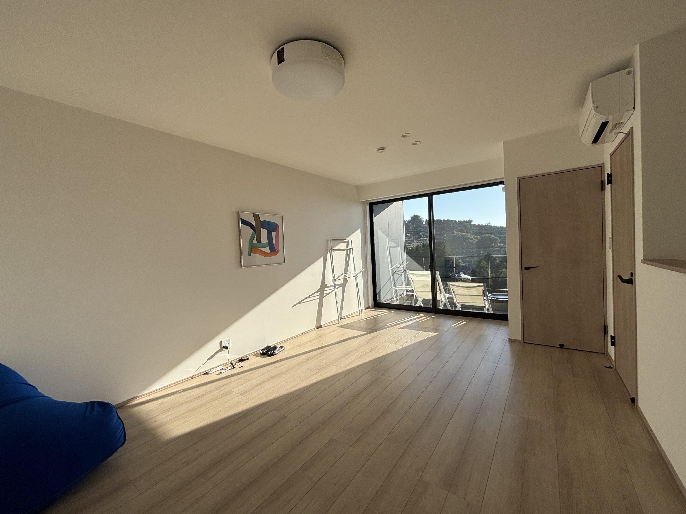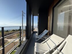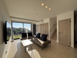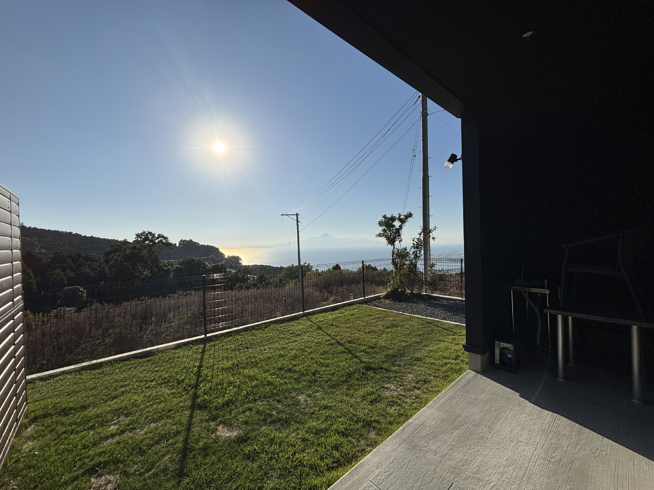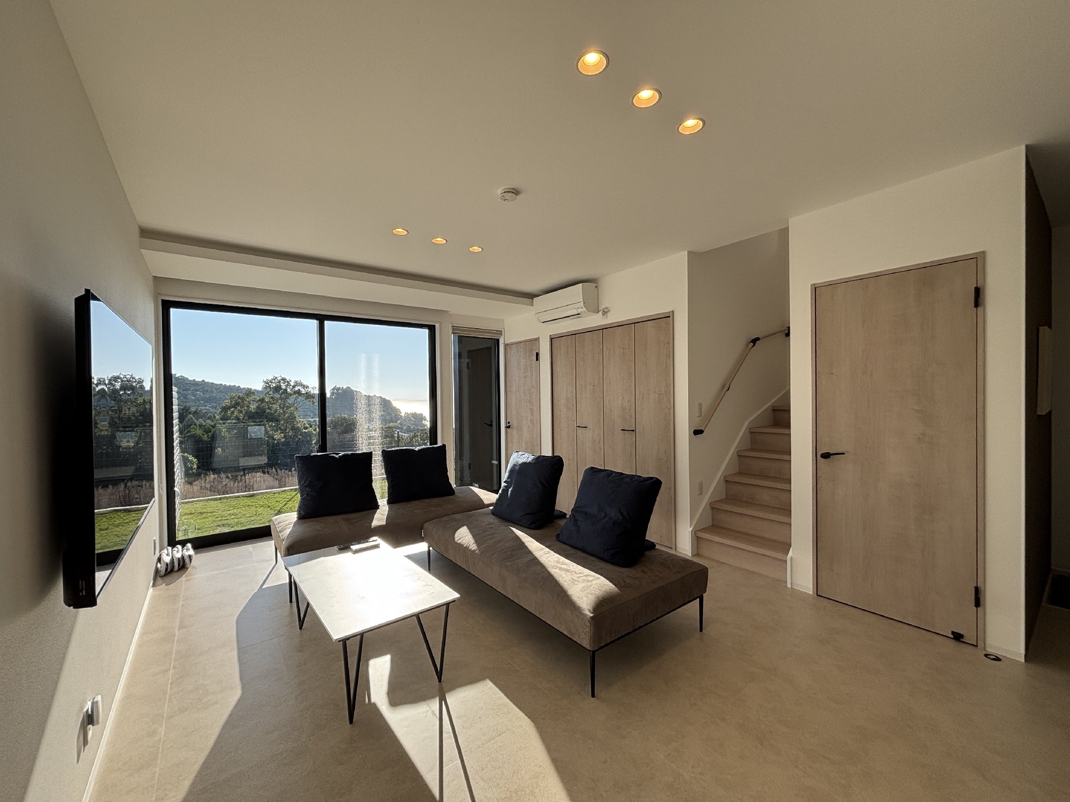 大きく開かれた窓いっぱいに広がるのは、海と丘陵のパノラマビューです。時間によって光の角度が変わり、モダンな空間に自然の陰影がやさしく重なります。