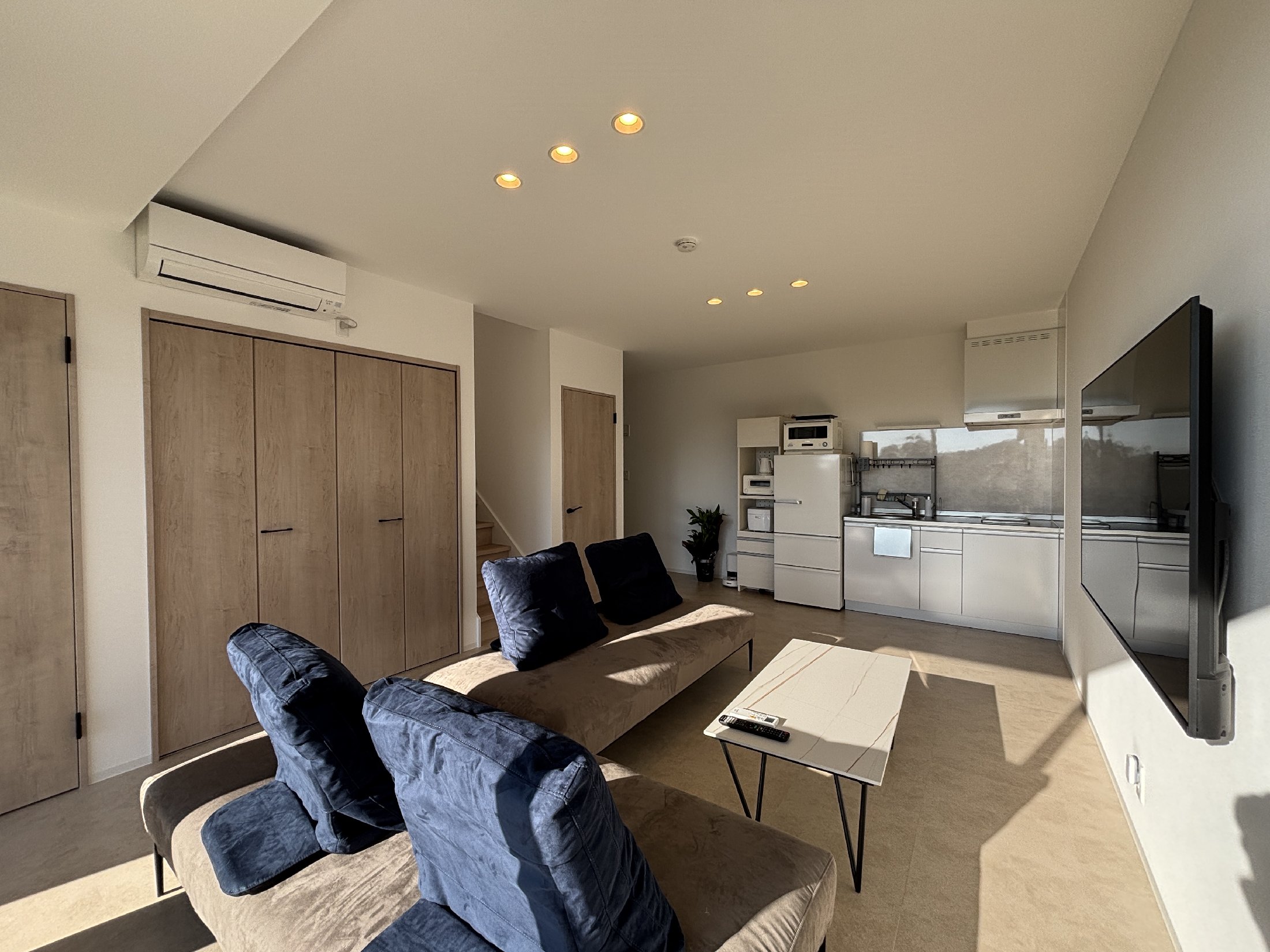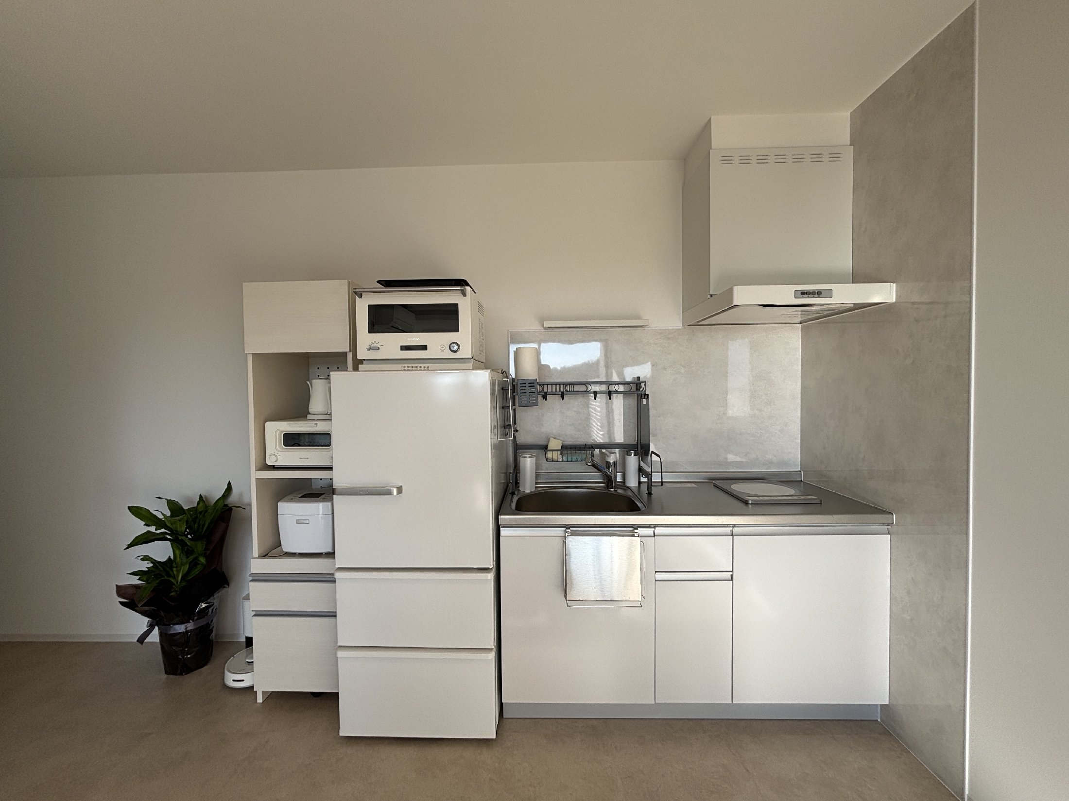 大型ソファIHコンロ・電子レンジ・炊飯器など調理設備も完備で自炊や長期滞在にも便利。
