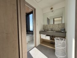 白と木目を基調とした室内は、清潔感と温もりを両立しています。ソファに腰を下ろし、ただ海を眺めるだけで、旅の疲れがすっと抜けていきます。