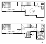 1階は、お風呂、トイレ、ベッドルームが1つあります。2階にリビング・キッチン、ベッドルームが1つあります。駐車場も1台分ご用意しておりますのでご家族でも快適にご利用できます。